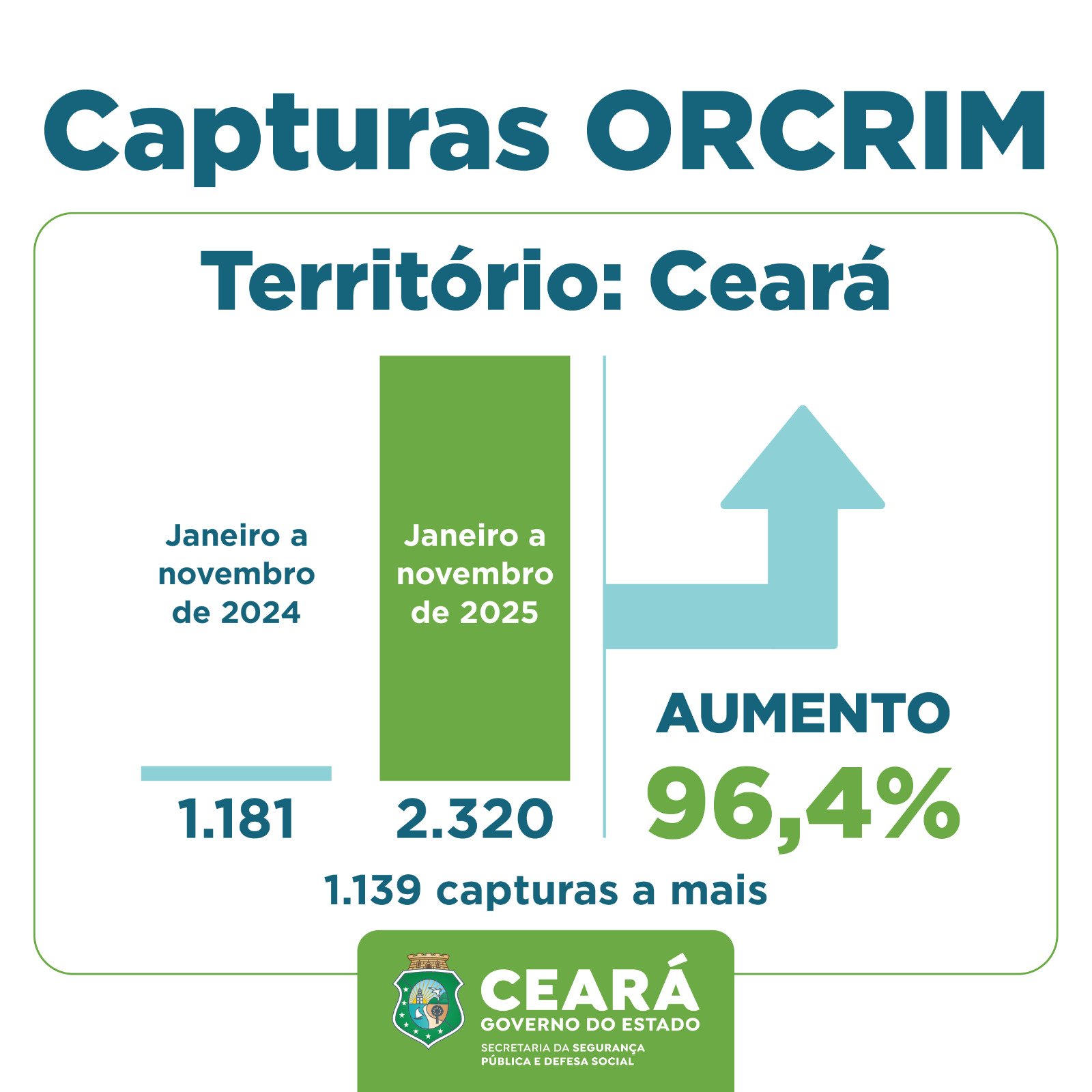 Somente em novembro de 2025, as Forças de Segurança do Ceará realizaram 1.016 prisões e apreensões em Fortaleza, aumento de 3% em relação ao mesmo mês de 2024, quando foram registradas 986 capturas. No estado, as capturas passaram de 2.693 em novembro de 2024 para 3.093 em novembro de 2025, alta de 14,9%.