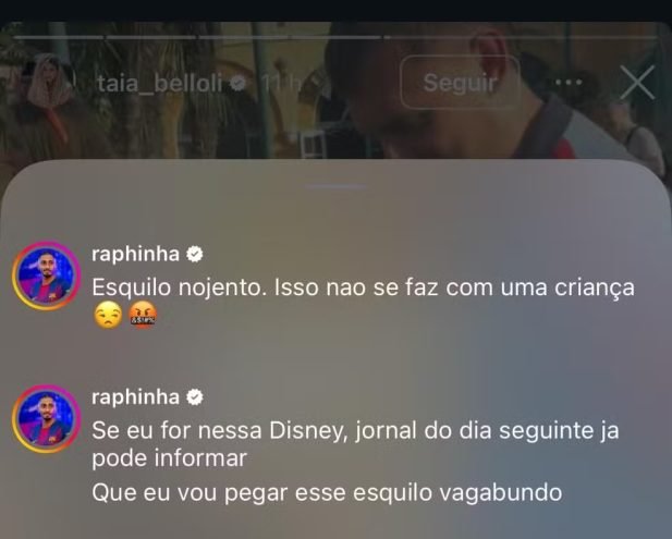 Raphinha chegou a reagir à postagem da esposa. “Esquilo nojento, isso não se faz com uma criança. Se eu for na Disney, jornal do dia seguinte já pode informar que eu vou pegar esse esquilo vagabundo”, avisou.