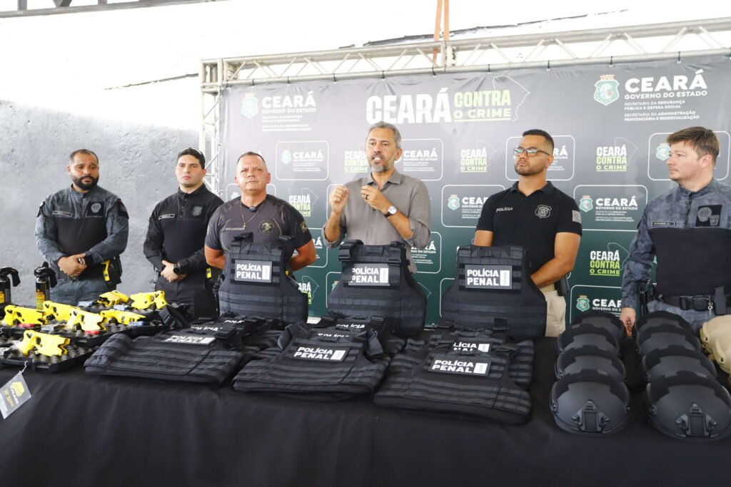 O governador Elmano de Freitas (PT) participou da entrega de mais de 3,3 mil equipamentos destinados aos policiais penais. A solenidade ocorreu nesta quarta-feira (14), na base do Grupo de Ações Penitenciárias, localizada em Aquiraz, na Região Metropolitana de Fortaleza (RMF).
