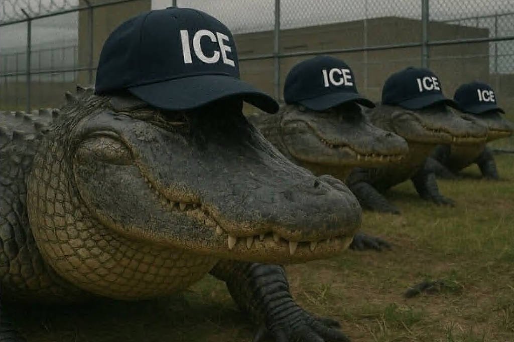 O Departamento de Segurança Nacional dos Estados Unidos, o órgão responsável pela campanha de deportação em massa de imigrantes sendo promovida pelo governo Donald Trump, publicou neste sábado (28) uma imagem de inteligência artificial mostrando jacarés com bonés do ICE, o serviço de imigração do país.