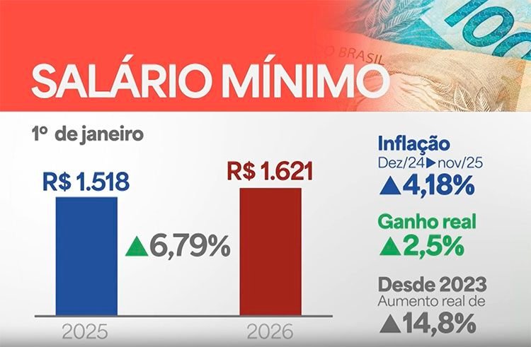 A partir deste 1º de janeiro de 2026, passam a valer duas grandes conquistas dos brasileiros: a isenção do imposto de renda para quem ganha até R$ 5.000 por mês e o reajuste do salário mínimo de R$ 1.518 para R$ 1.621 (6,79%).
