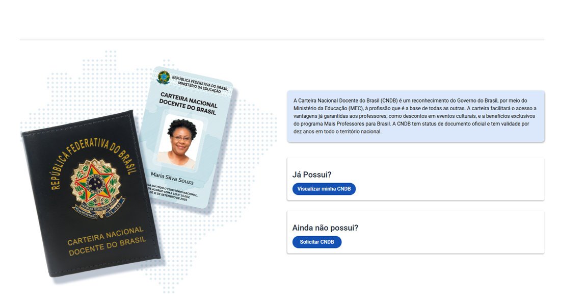 Professores de todo o país podem solicitar a Carteira Nacional Docente do Brasil (CNDB) por meio do sistema Mais Professores , do Ministério da Educação (MEC). A CNDB é um documento de identificação destinado aos professores da educação pública e privada. Ela tem validade de dez anos, é gratuita e aceita em todo o território nacional. Podem solicitar o documento professores de todos os níveis e etapas da educação.